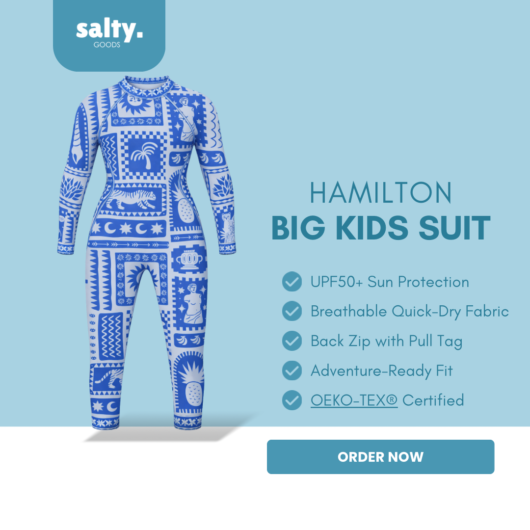 Let your bigger adventurer roam wild and free -without worrying about the sun or the sea. Our UPF50+ Big Kids Stinger Suit is built for fearless days on the reef, long boarding sessions, and salty breezes across the sand.